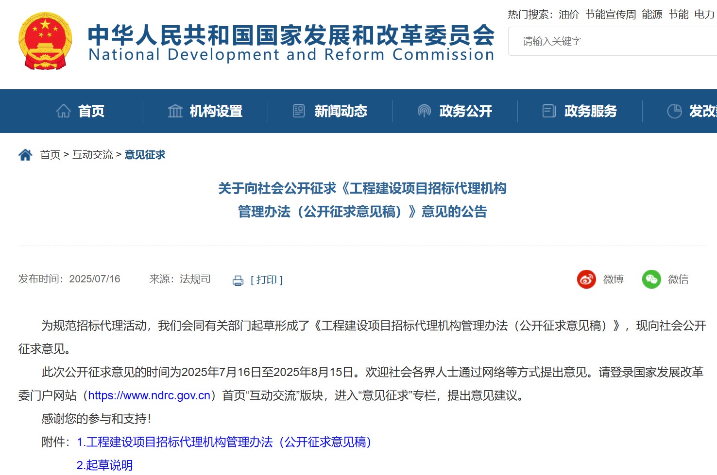 為規(guī)范招標(biāo)代理活動(dòng),國家發(fā)展和改革委員會(huì)會(huì)同有關(guān)部門起草形成了《工程建設(shè)項(xiàng)目招標(biāo)代理機(jī)構(gòu)管理辦法(公開征求意見稿)》,現(xiàn)向社會(huì)公開征求意見。此次公開征求意見的時(shí)間為2025年7月16日至2025年8月15日。